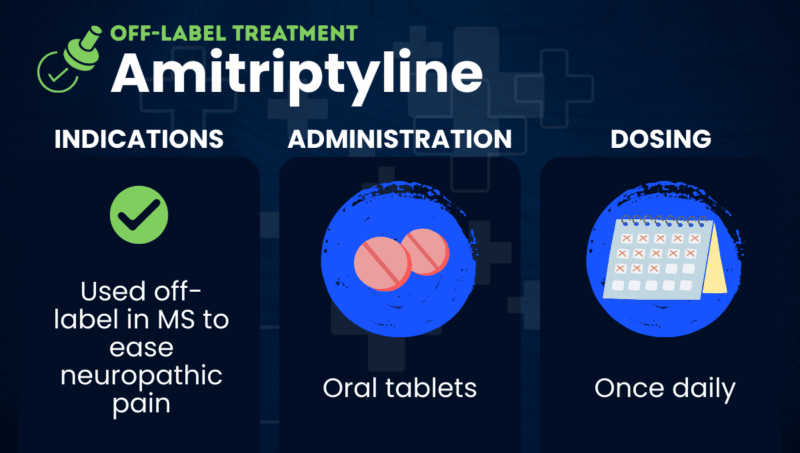 Amitriptyline is an oral therapy that’s approved in the U.S. to treat depression, which is sometimes also used off-label for the management of neuropathic pain, or pain related to nerve damage, in people with multiple sclerosis (MS).