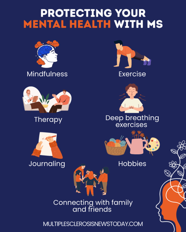 Coping strategies that might help MS patients manage their mental health on a day-to-day basis can include talking with family and friends, writing your feelings in a journal, and seeking other ways to center yourself and regain your sense of calm.