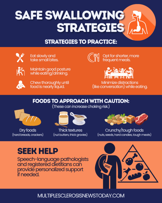 If you struggle with MS and dysphagia, getting medical attention and being assessed by a speech-language pathologist is essential to minimize symptoms.
