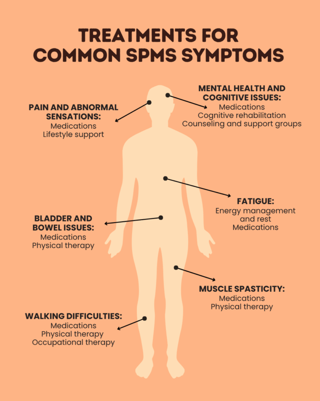 A wide range of medications and interventions are used for managing symptoms of SPMS. These supportive treatments don’t slow disease progression, but they can make daily living with MS easier.
