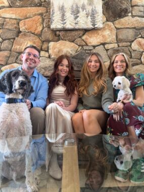 The Schnieders family celebrates Thanksgiving 2025 at home. From left, dog Cali, husband Dave, daughter Hadley, daughter Georgy, and Denise holding dog Tinsel.