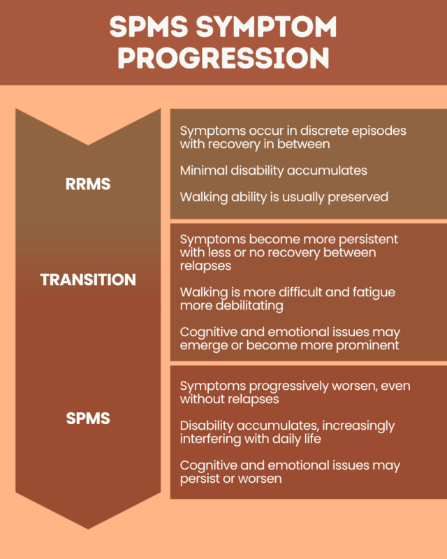 There is no single course of progression in SPMS, so the exact symptoms and how quickly they worsen can vary from person to person. Still, some of the most common SPMS symptoms include: