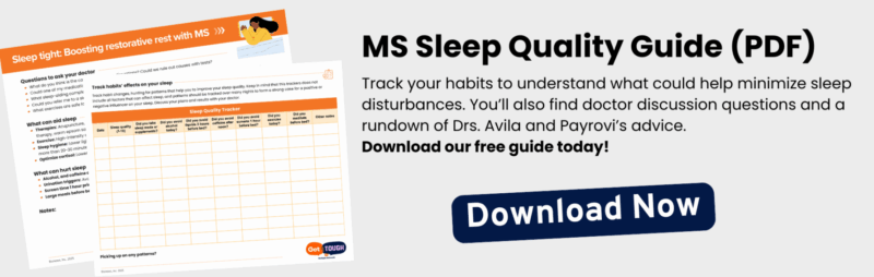 Our sleep quality guide includes discussion questions to ask your doctor, practical advice covered in the episode, and a tracker that can help you identify contributors to sleep disturbances. Discuss your observations with your MS doctor or sleep specialist.